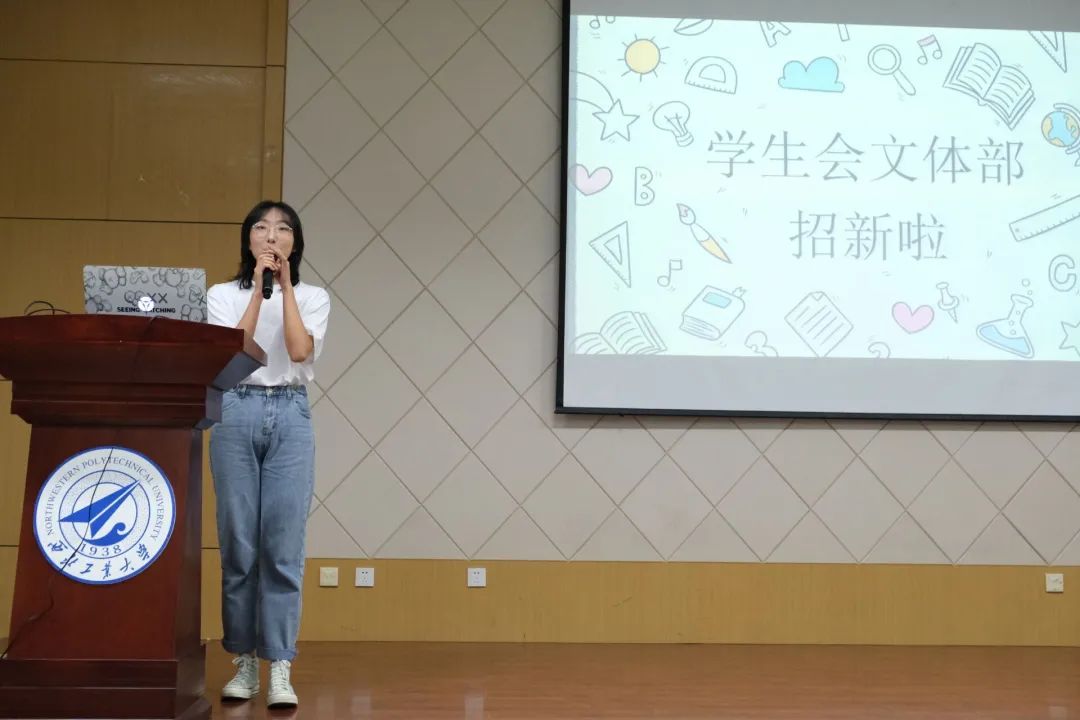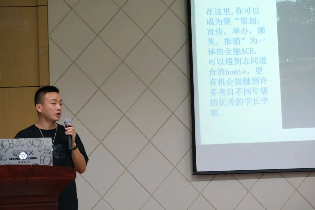 学生会文体部负责人崔世敏代表文体部进行了招新宣讲。区别于团委的文体中心,学生会文体部负责文体活动的组织宣传、组织承担学院文娱类相关活动、积极配合其他部门共同开展举办完成各类活动等。在慰问演出、迎新晚会、合唱比赛、合办福尔摩斯推理大赛、游园会等学校活动中都能看到文体部的身影。