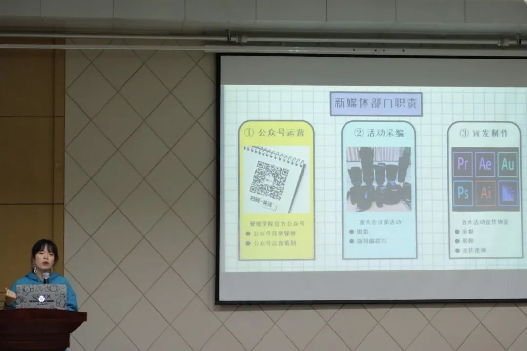 团委新媒体中心负责人林修如代表新媒体中心进行招新宣讲。团委新媒体中心是精通新媒体性的专业团队,是学院新媒体平台的专属管家,负责公众号的日常管理和运营策划;是各大会议、活动的前线记者,负责重大会议活动的摄影和撰稿;是活动宣发的第一生产力,负责海报、展板、宣传视频等的制作。