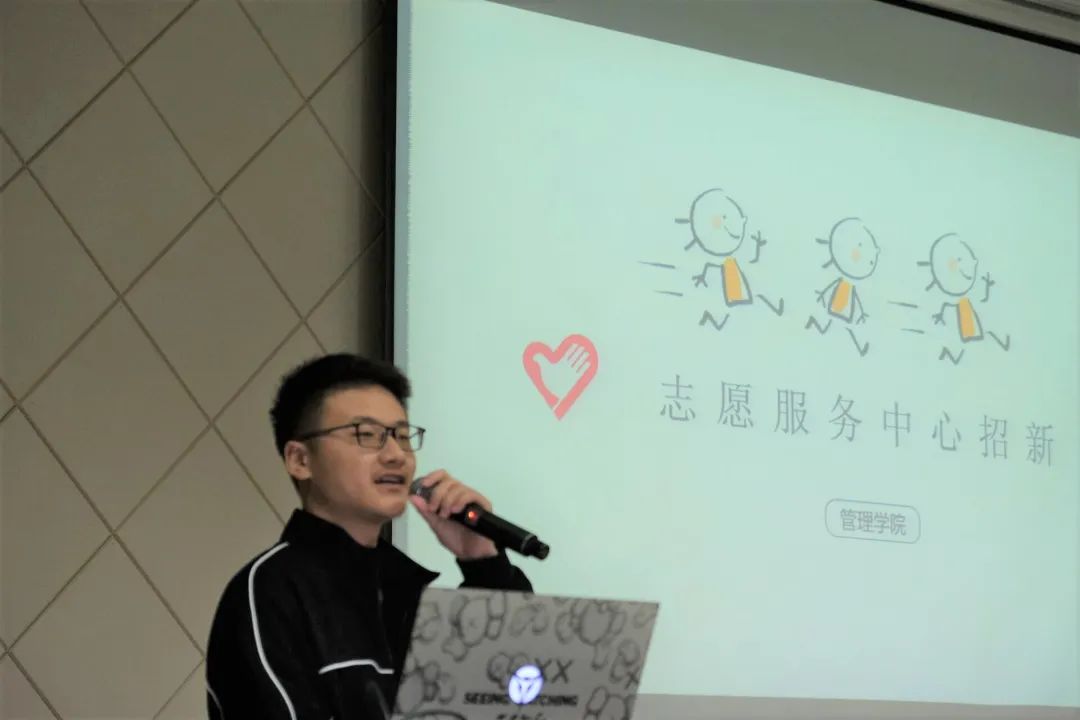 团委志愿服务中心负责人朱文杰代表志愿服务中心进行招新宣讲。宣讲伊始,朱文杰同学先通过一段有趣的视频吸引了同学们的兴趣,也让同学们初步认识了志愿服务中心。志愿服务中心旨在培养学生的劳动实践能力,把“奉献、友爱、互助、进步”的志愿者精神嵌入在志愿活动中,是大学生参与社会实践活动的重要平台。