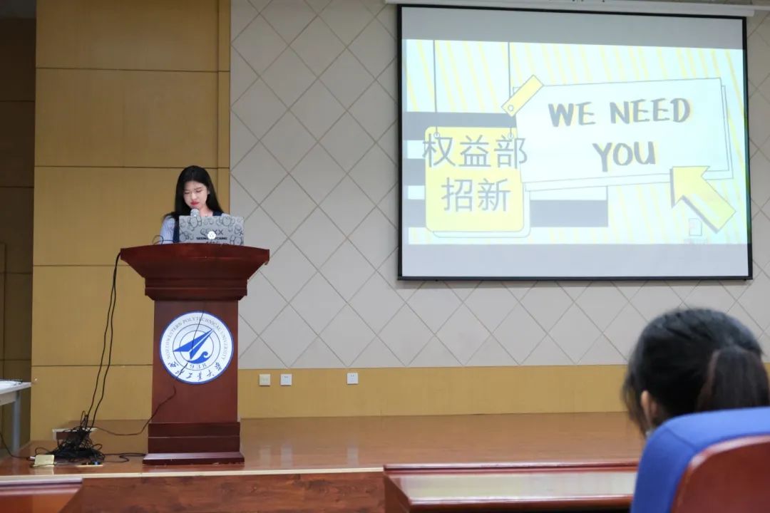 学生会权益部负责人张宝怡代表权益部进行了招新宣讲。学生会权益部是帮助学院同学反馈问题、解决问题的机构,是以服务广大学生为原则、维护广大学生权益为宗旨、是与广大学生切身利益联系最为密切的部门,包括脱口秀大会、生存福利、问题信箱、与领导们的“茶话会”等部门特色活动。权益部现任负责人分别为张宝怡、张敬昱、赵艳蓉。