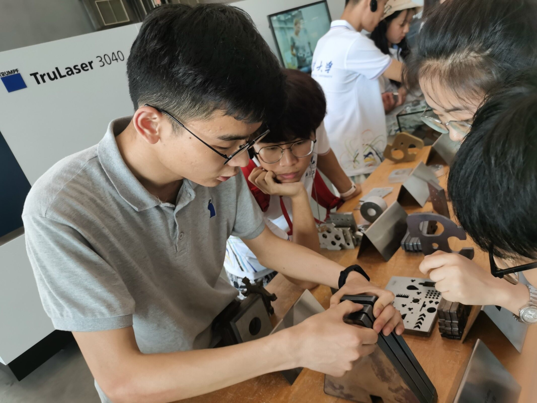 在产品经理的带领下,实践队对通快公司正在使用的ERP 企业我系统、正在追求的工业4.0发展模式等生产方式有了一定的了解。随后我们参观了通快公司的展厅,了解到了通快(中国)有限公司的发展历史,近距离观看到以“自动化+智能机器人”为基础而实现的折弯技术、激光切割技术等。为了能让同学们更好地体验到自动化生产的魅力,通快(中国)有限公司还为同学们赠送了利用激光切割实现的小车模型,同学们在动手制作中体会到了通快先进科技带来的方便快捷。