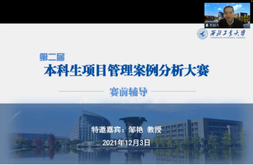 在等待分数汇总的间歇,本届大赛所使用的案例的主人公、作者之一,北京世邦华亿舞台科技公司总经理王啸岩出现在大屏幕上,与大家分享了对项目管理重要性的认识。紧接着我院项目管理专家、西安华鼎公司总经理白思俊教授发来了祝贺大赛成功举办的致辞视频。两位神秘嘉宾的隔空出现让评委和同学们惊喜不已。