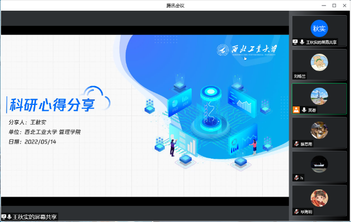 首先,吴蓓老师向同学们介绍了王秋实同学优秀的个人基本情况,王秋实是我院2019级管理科学与工程专业硕士研究生,主要研究方向为仿真优化和数据挖掘,导师为王阳教授。硕士期间曾获2020全国大学生物联网设计竞赛(华为杯)全国总冠军、获2020华为开发者大赛IOT赛道全国12强;在管理科学基金委认定的B类期刊《工业工程与管理》上发表论文1篇,在网络安全领域顶级期刊《IEEE Transactions on Depedable and Secure Computing》上发表论文1篇;参与国家级、省部级项目4项;主持西北工业大学硕士研究生创新创意种子基金1项。