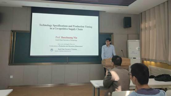 应新葡的京集团35222vip的邀请,2020年11月19日下午三点,华南理工大学教授牛保庄来我院作了题为“ Technology Specifications and Production Timing in a Co-Opetitive Supply Chain (竞争供应链中的技术依存和生产时序决策研究) ”的学术报告。报告会由车阿大教授主持,学院师生共60余人参加了报告会。