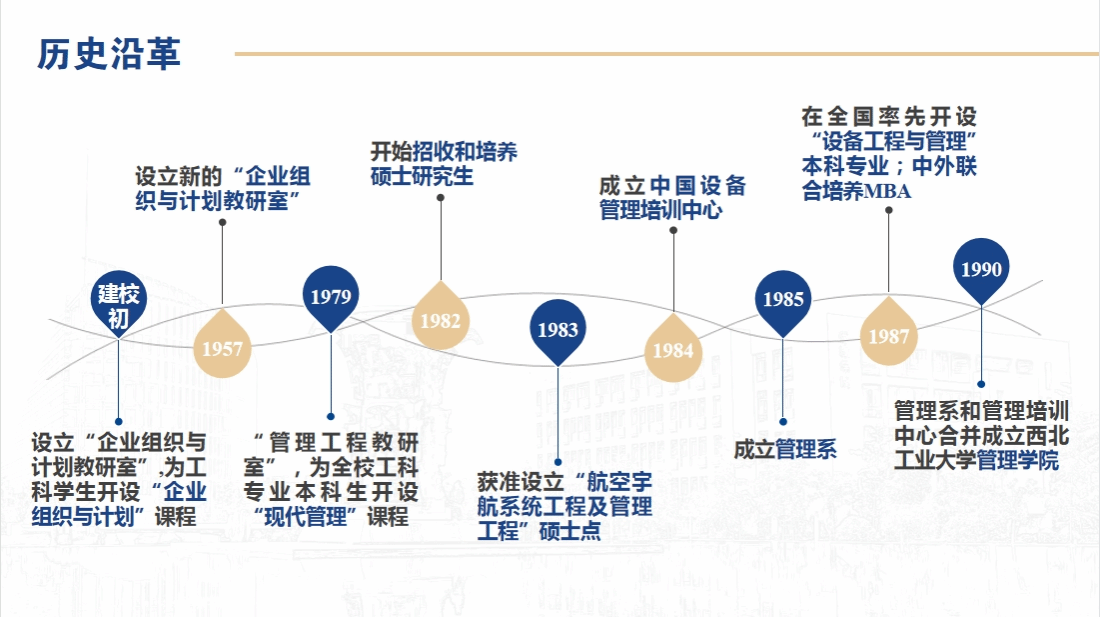 西北工业大学的前身西北工学院和华东航空学院(西安航空学院)自建校之初就设有“企业组织与计划教研室”,为工科学生开设“企业组织与计划”课程。1957年并校后设立新的“企业组织与计划教研室”。1979年,“企业组织与计划教研室”发展成为“管理工程教研室”,隶属于原“飞行器制造工程系”,为全校各工科专业本科生开设“现代管理”课程,1982年开始招收和培养硕士研究生。1983年获准在西北工业大学设立“航空宇航系统工程及管理工程”硕士点。在此基础上,1985年成立我系。